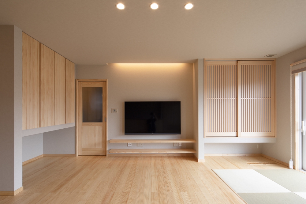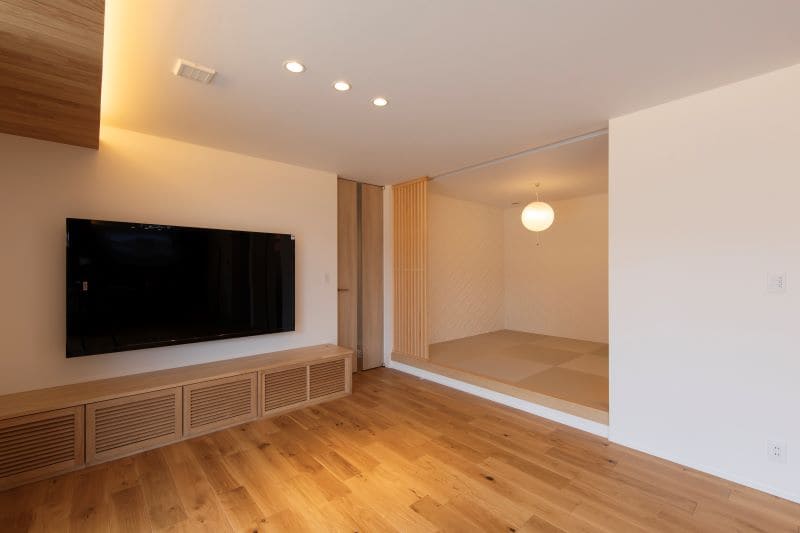 リビングに隣接した4.5帖の小上がり和室。天井にロールカーテンを埋め込むことで、来客時には個室として使用するなど、多目的に空間を仕切ることができます。造作のテレビ台も、あたたかみのある木質感にこだわりました。