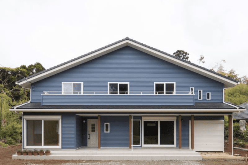 青×白のカリフォルニアスタイルの外観に、大きなバイクガレージを設置。内装は、ご要望のアメリカンダイナーを忠実に再現しました。二世帯住宅として玄関は共有しつつ、水回りは別々にすることでプライバシーを確保。22帖のLDKと趣味部屋から愛車を眺められる間取りです。快適な暮らしのため、全館空調システムも採用。趣味を堪能できる理想の住まいが実現しました。