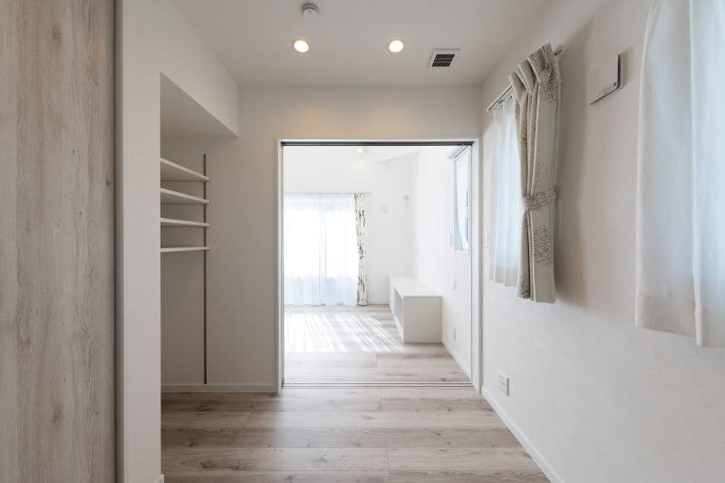 開け放てば視線が奥まで抜け、広々とした開放感が生まれます。来客時やライフスタイルの変化に合わせて空間を仕切ることもできる柔軟な間取りです。視覚効果を取り入れ、コンパクトでも広がりを感じられる工夫を凝らしました。