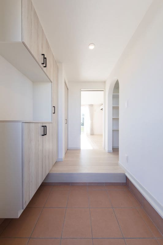 玄関を開けた途端、ホッとするような明るく、清潔感のある空間。壁面収納の水平線がリビングにやさしく誘導されるような動線。塗り壁に似合うアーチ壁の設計も工夫したポイントです。