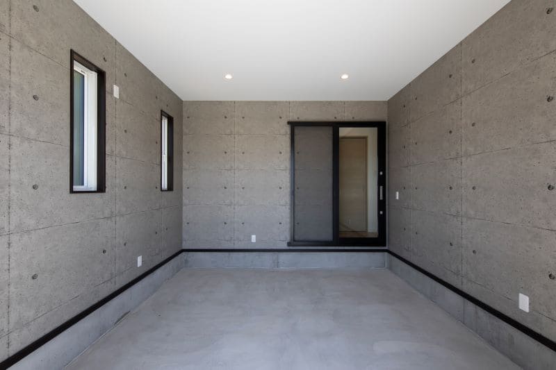 お客様の「憧れ」を忠実に再現した、広々としたインナーガレージです。 お客様から提供された写真をもとに、壁面は打ちっぱなし風のクロスでスタイリッシュに仕上げました。愛車をゆったりと格納できる広さを確保し、趣味の時間を存分に楽しめる特別な空間となっています。
