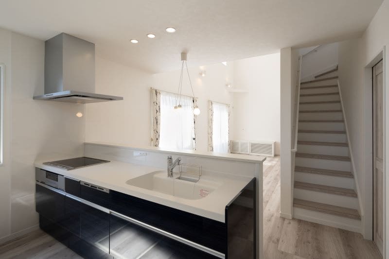 キッチンは落ち着いた天井高で、リビングは吹き抜けの開放感が心地よく広がります。白を基調とした空間に黒のキッチンがほどよいアクセントを添え、空間全体を引き締めています。リビング脇の階段からは2階の家族の気配がやさしく伝わり、程よいつながりを感じられる間取り。それぞれの時間を大切にしながらも、自然とコミュニケーションが生まれる住まいです。
