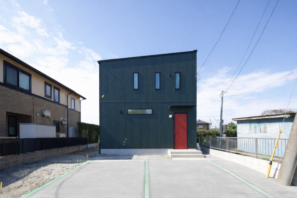 メインの外壁には、メンテナンス性に優れたガルバリウムを採用。玄関側の外壁には、モダンな印象を与える旭トステムのサイディングを採用し、素材感と色合いのコントラストが際立つデザインに仕上げました。