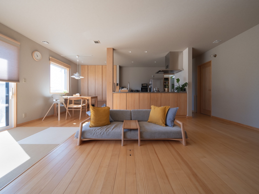 木のぬくもりに包まれた、家族の中心となる大空間LDK。 この住まいの大きな特徴は、廊下を排除した間取りです。リビングに直接、お子さまの部屋や寝室、ランドリーといった各スペースのドアを設けることで、空間を最大限に有効活用しています。