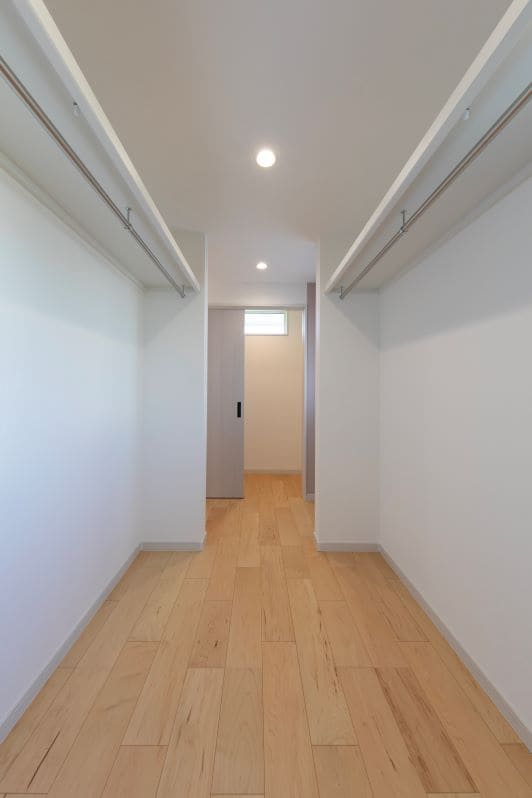 両サイドにたっぷりとハンガーパイプを配置し、家族の衣類をまとめて収納できる便利な空間です。奥行きのある設計で、実際以上の広がりを感じられます。2階の洗濯干しスペースからも近く、乾いた洗濯物をそのまま収納できる動線も魅力。家族みんなの衣類が一箇所に集まることで、朝の身支度もスムーズに。暮らしやすさを支えるファミリークローゼットです。