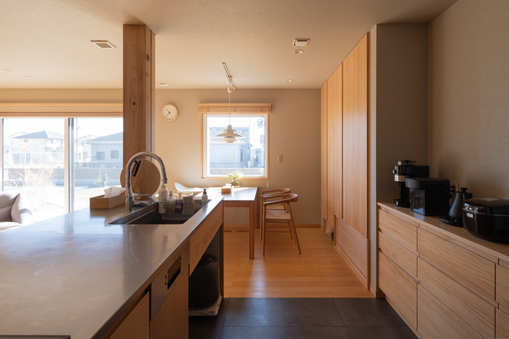背面収納をはじめ、たっぷりの収納を備えたキッチン。物が散らからず、いつでもすっきりとした空間を保てます。 このキッチンの大きな特徴は、ガレージと隣接している点です。買い出し品の搬入や、趣味の道具の手入れなど、家事動線と趣味の動線がスムーズに繋がるよう配慮し、利便性を高めました。