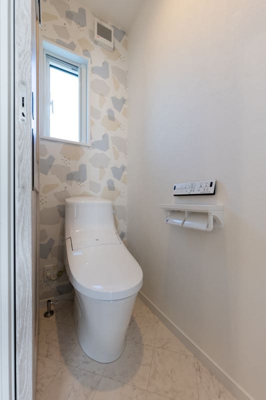 グレーを基調とした壁面と床材が、静かで落ち着いた印象を与えるトイレ空間です。窓から差し込む柔らかな自然光に加え、幾何学的なデザインのペンダントライトが空間にユニークなアクセントと温かい光を添えています。