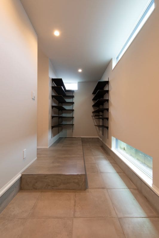 広々としたおしゃれな土間玄関は、無骨なモルタルと洗練されたモルタル調のタイルシートで仕上げた框が、空間全体をぐっと引き締めます。利用シーンを想定したL字型で設計し、奥には大きなサーフボードもしまえるシューズクロークや、ロードバイクをかけられる広い壁を設けるなど、機能性も兼ね備えました。
