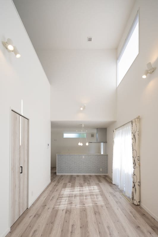 吹き抜けから自然光がたっぷりと注ぎ込む、開放的なリビング空間。キッチンカウンター下のレンガ調壁紙が、白を基調とした空間にほどよいアクセントを添えています。夜には、ペンダントライトの温かな光が家族を包み込む、一日の時間の移ろいを感じられる心地よい空間です。