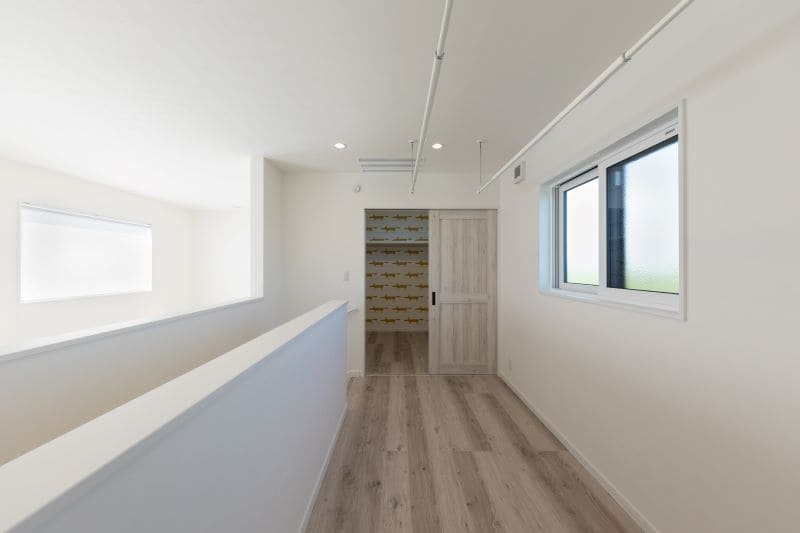 枕棚とハンガーパイプでたっぷり収納できる機能性と、遊び心あるデザインが共存する空間。寝室から直結する動線で、朝の身支度もスムーズに。全館空調を採用しているため、クローゼット内も快適な温度が保たれ、衣類にとっても優しい環境です。