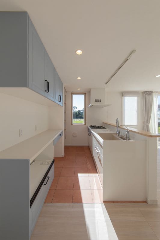 グレーとホワイトの組み合わせが、やさしく洗練された印象を演出しています。キッチン奥のスリット窓からは明るい自然光と外の景色が届き、調理中も開放的で心地よい時間が流れます。テラコッタ調のフロアタイルが温かみを添える、毎日の料理が楽しくなるキッチンです。