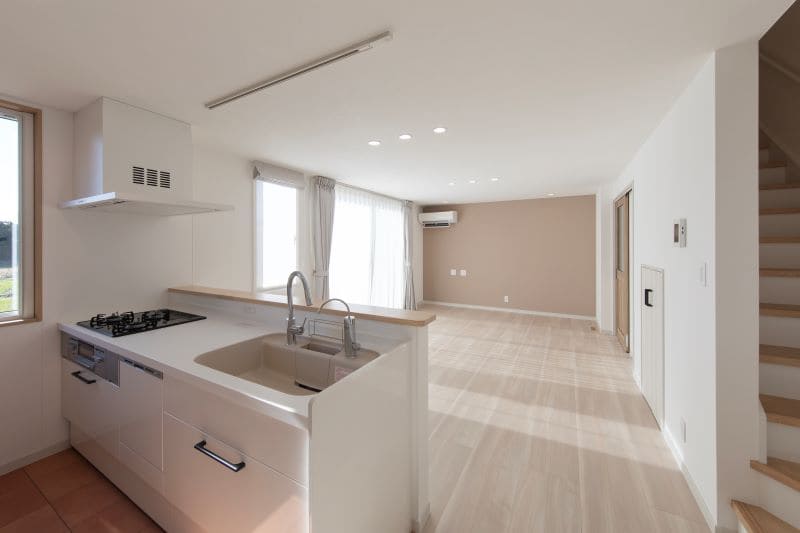 LIXIL「リシェル」のキッチンを、リビングを見渡せる場所に配置しました。料理をしながらでも家族の様子を感じられる、あたたかい空間です。床にはフロアタイルを使用し、見た目の美しさと掃除のしやすさを両立させた、機能的なキッチン空間に仕上げています。
