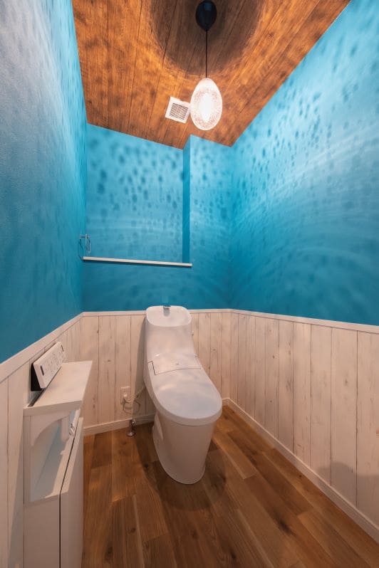 トイレも妥協しない、個性的なデザイン空間に。目を引くブルーの壁と、温かみのある木目調の天井の組み合わせが、リゾートホテルのような雰囲気をもたらします。お客様のセンスが光る、特別なサニタリー空間です。