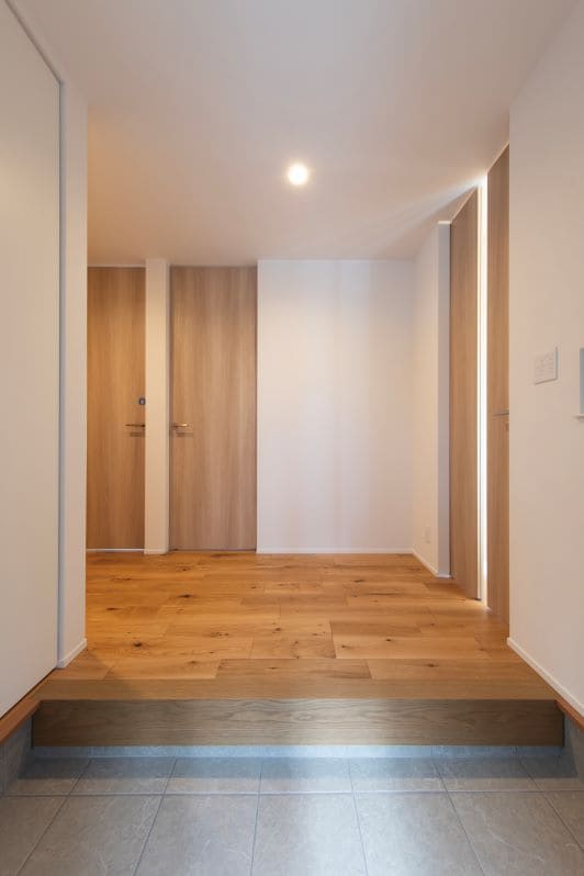 木の温もりを感じさせる木目調の壁に、土間のタイルがアクセントになったエントランス。家族用とゲスト用を分けた動線を確保し、いつでもすっきりとした印象を保てます。