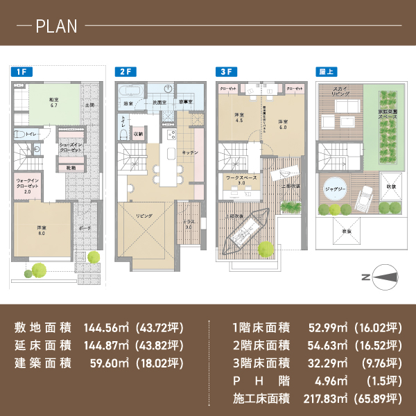 快適でゆとりのある3階建て。住居の前にはおしゃれなアプローチと駐車スペースも確保しています。間取はできるだけ快適さとゆとりを感じるプランを採用。1階に水回りをまとめ、3階には共有できるウォークインクロゼットを設けるなど、空間を有効に活用。その代わり、趣味を楽しむ部屋や広めのバルコニーなど、狭小という制限を感じさせないゆとりのスペースを生み出しています。