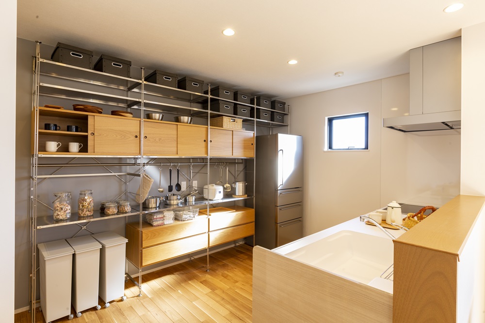 キッチンの横にパントリーをプランニング。造作の棚には扉をつけなかったので、必要なものがサッと取れて便利◎