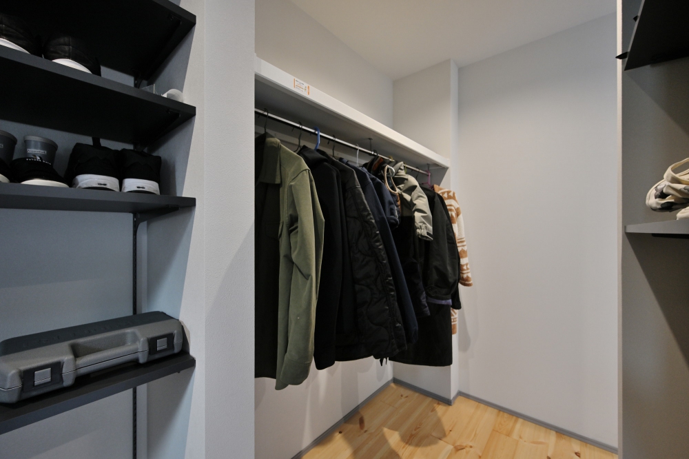 シューズクロークは靴以外にもコート掛けやキャンプ用品の収納に使用できる。身支度スペースとしても大活躍。