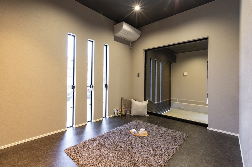 インナーガレージに隣接する趣味室。自宅バーのようなスペースにして、愛車を見ながら過ごすそう