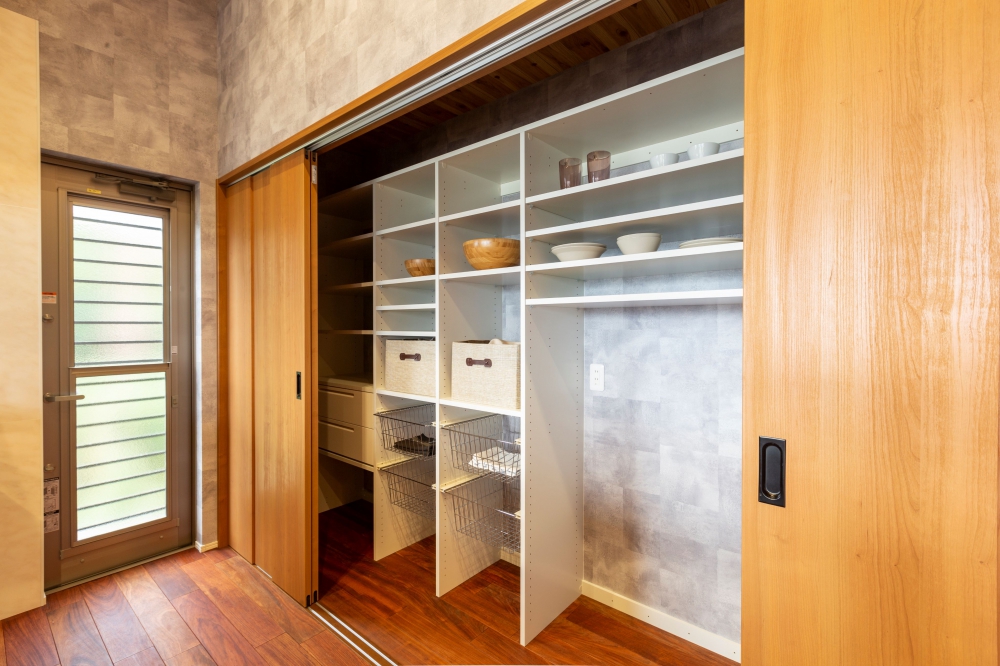 玄関ホールから直接パントリーへ。買い物から帰ったら、パントリーで荷物を仕舞ってキッチンへと進む間取り
