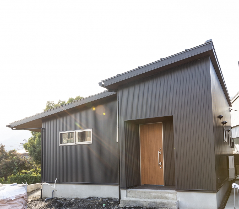 片流れ屋根のシンプルなフォルムにダークブラウンの外壁で落ち着きあるデザイン