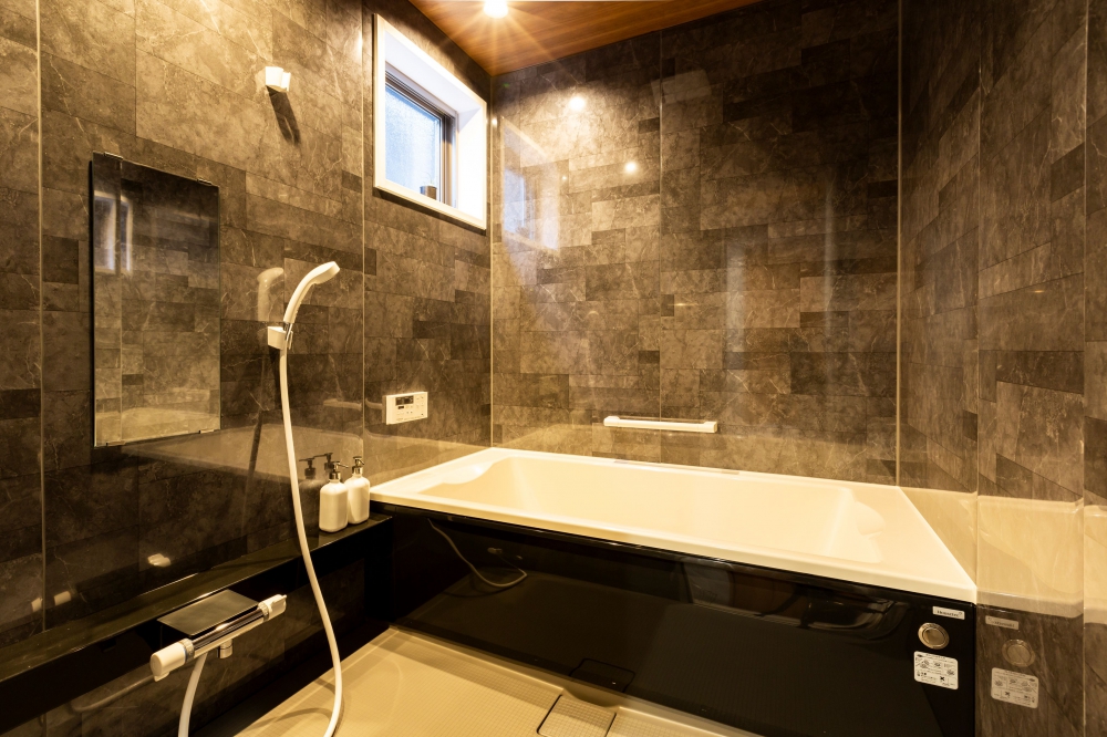 足を伸ばしてゆったりと入浴。石調のパネルで重厚感ある仕上がり