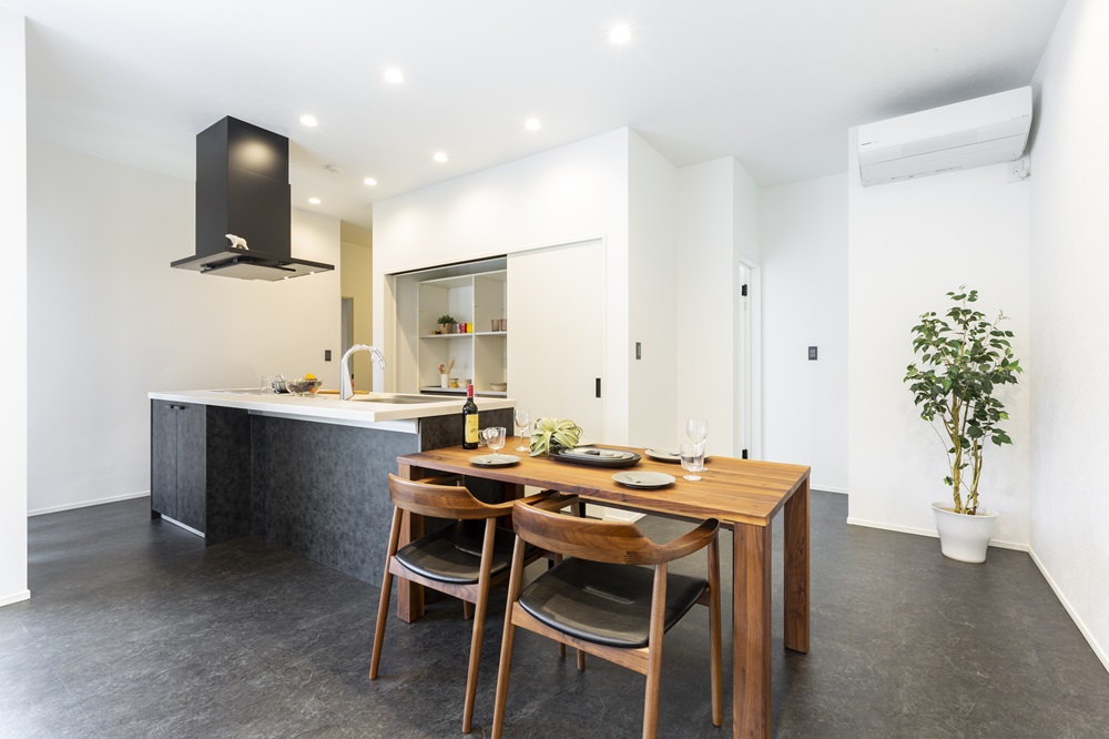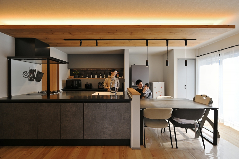ダイニングとキッチンは横並びなので配膳や片付けの導線がスムーズに。システムキッチンはスタイリッシュなダークグレー。キッチン後ろの造作の棚にはお酒がディスプレイされている。キッチンの前面にはたっぷり収納を確保。