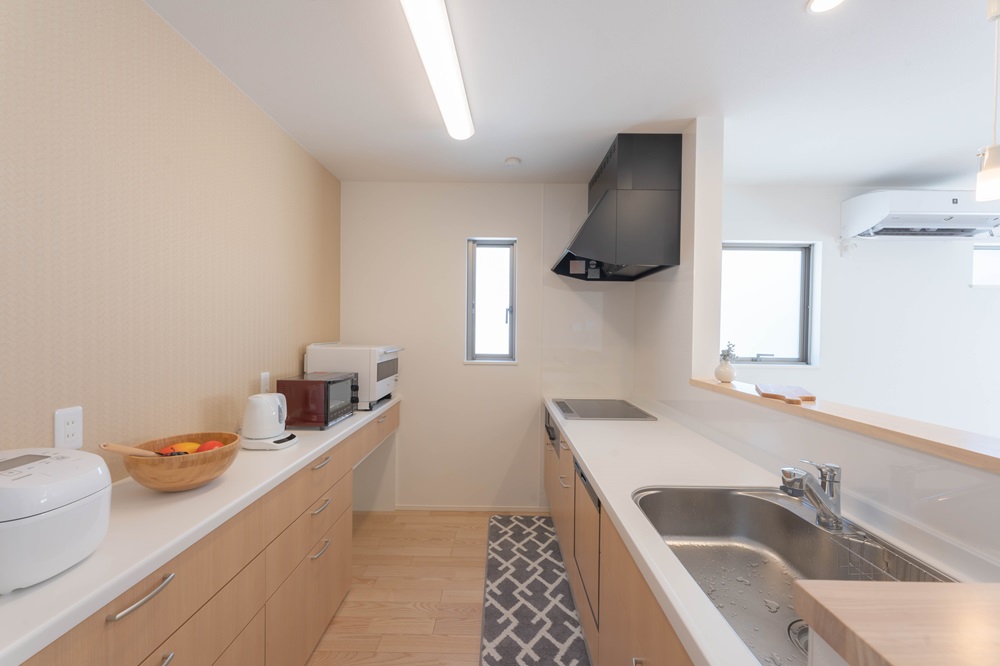 白をベースにメープルの木質感が映えるナチュラルデザイン。手元が隠れる高さのキッチンで、視界はいつもすっきり