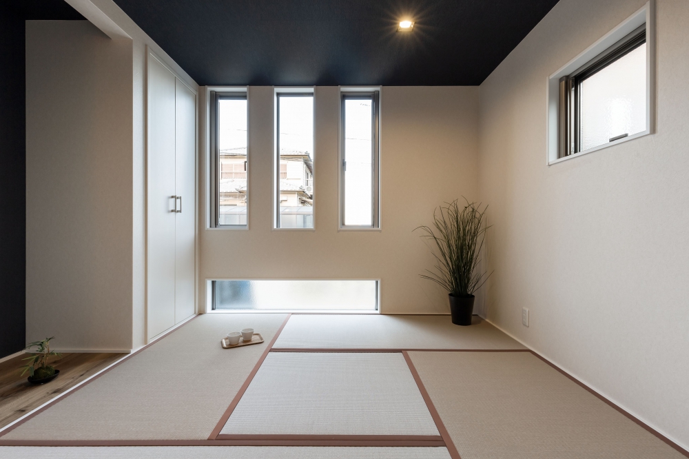 琉球畳でスッキリとした印象の和室。造作のカウンターは将来お子様が勉強できるように設置。