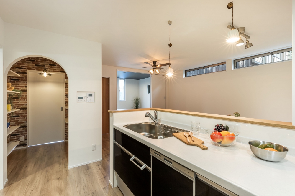 パントリーの内部はレンガ調のクロス。入り口をアールにして可愛らしく仕上げた