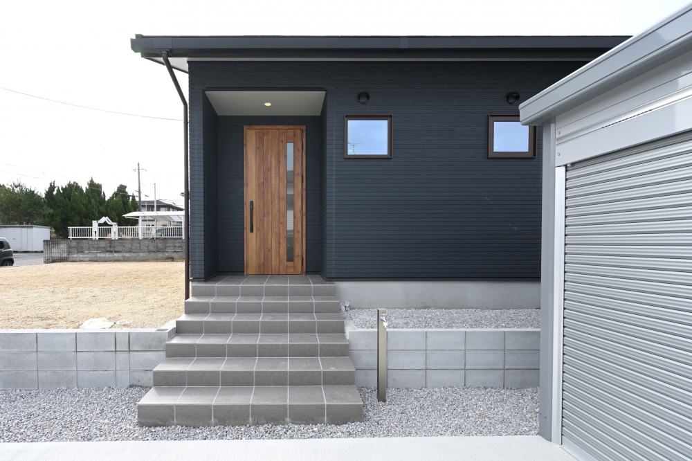 ネオブラックのストレート屋根に木の温かみをプラス。