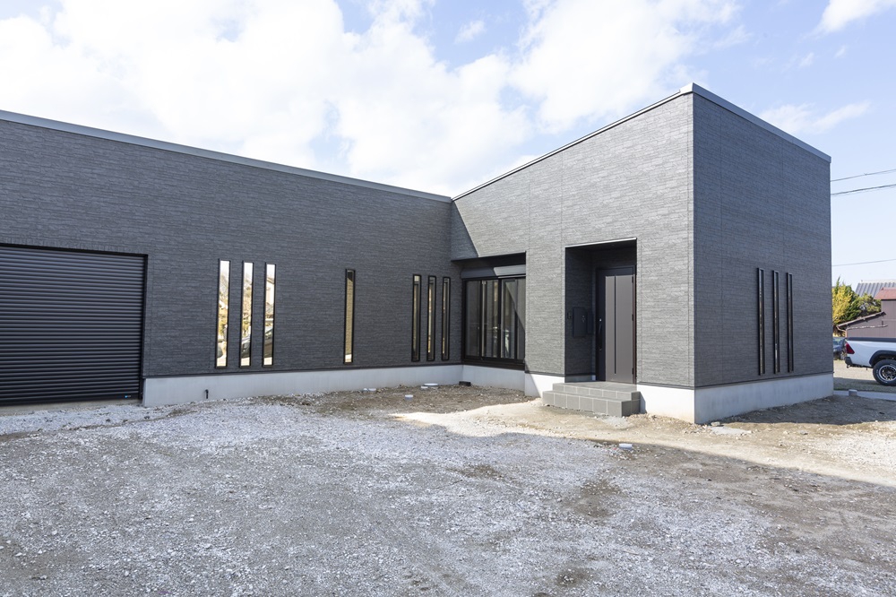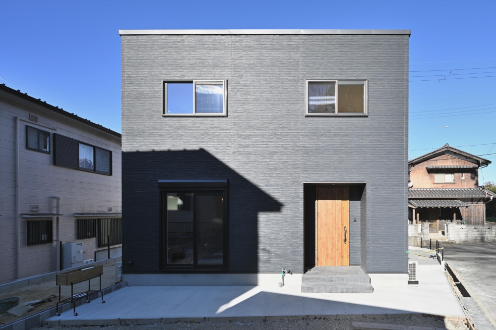直線的なフォルムに黒い外壁が映える。前面道路側の窓は極力小さくして、防犯面にも配慮した。合計4台が駐車できる