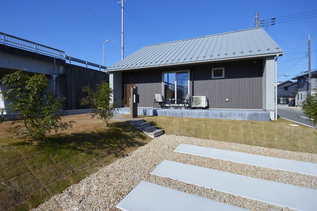 ガルバリウム鋼板のスタイリッシュな外壁に、片流れの大屋根。すっきりと端正な平屋の住まい