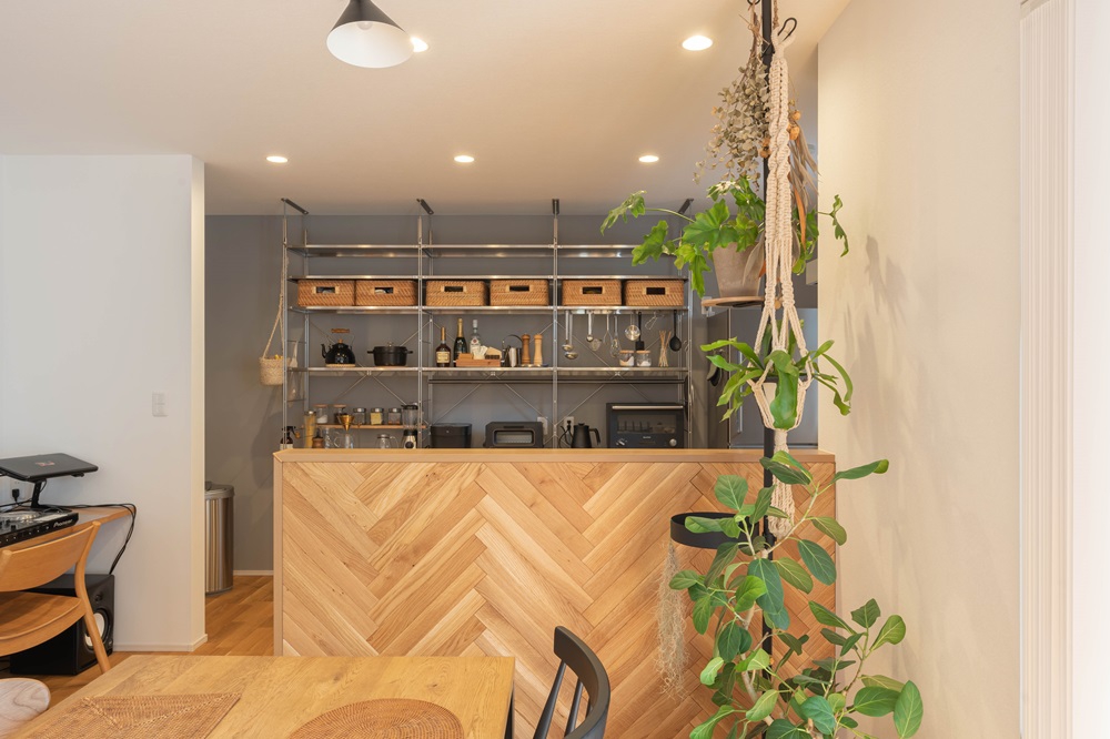 キッチンカウンターのヘリンボーン張りがデザインアクセント