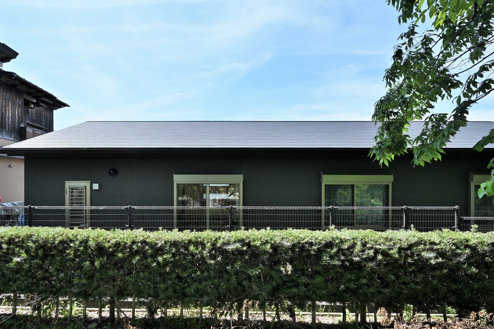 緑地帯のそばに建つNさんの住まい。平屋の大屋根とモダンな黒い外壁で、シンプルさの中にこだわりが光るデザイン