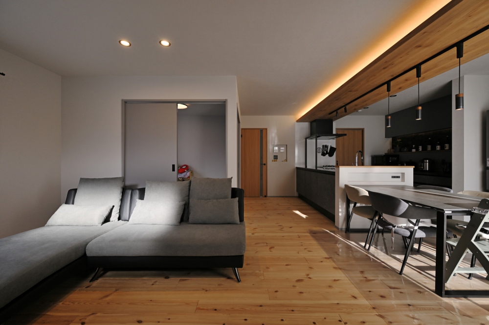 21帖の広々LDK。建具や家具を優しいグレーでカラーコーディネート。折り下げ天井の間接照明が柔らかな光を照らす。