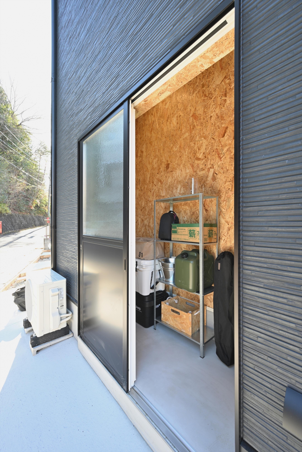 キャンプ好きのお施主様の大切なキャンプ用品を収納できる外部収納。