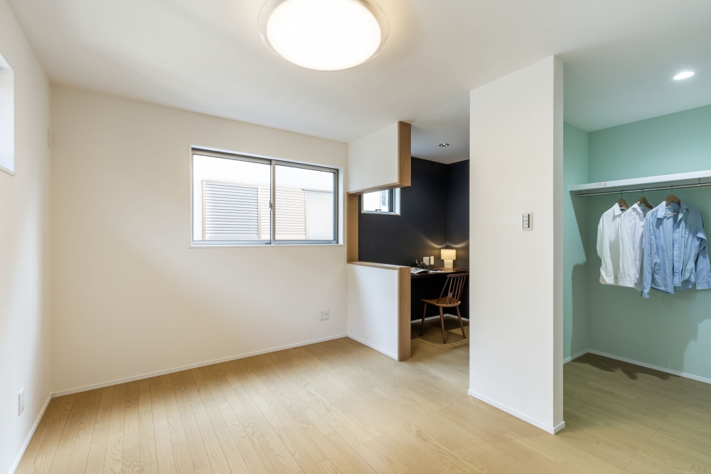 寝室に書斎とクロゼットを併設。それぞれ別の色のクロスにして雰囲気を変えている
