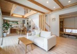 ご夫婦でくつろぐ時も、お友達が集まる時も、心地よく過ごせる開放感のあるLDK。勾配天井のリビングは、無垢の梁が木のぬくもりを感じさせてくれます。手すり、引き戸、広めの水回りなど、ずっと快適に暮らすための工夫をあちこちに盛り込みました。