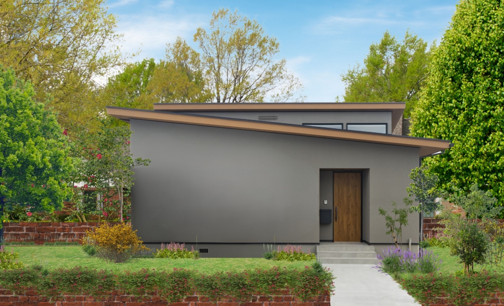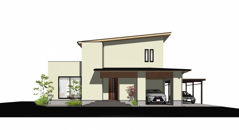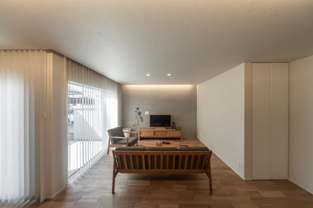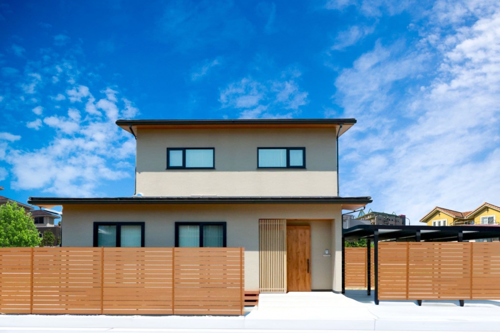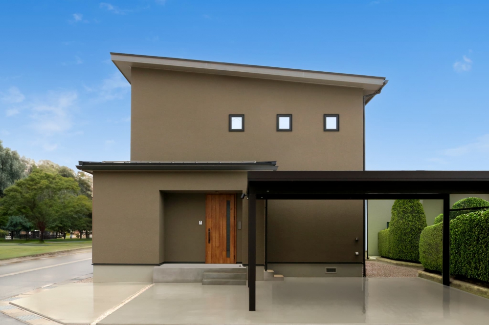 継ぎ目のないモルタル吹付外壁が、外観から室内に統一感を与え、和モダンな雰囲気を演出しています。