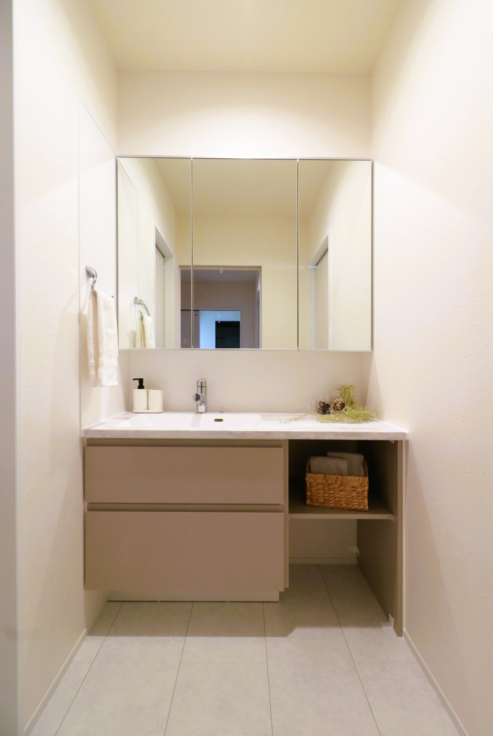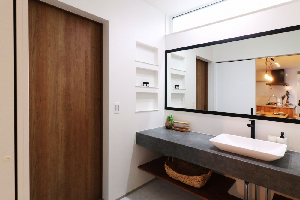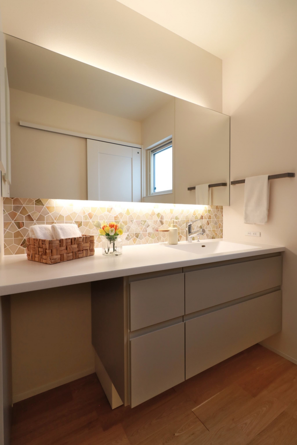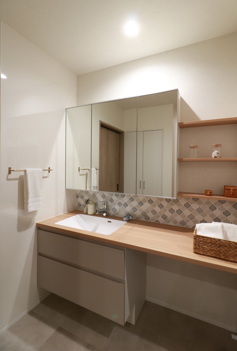造作洗面には美濃焼タイル「カッセ」を採用し、実用性とデザイン性を兼ね備えた空間を演出。