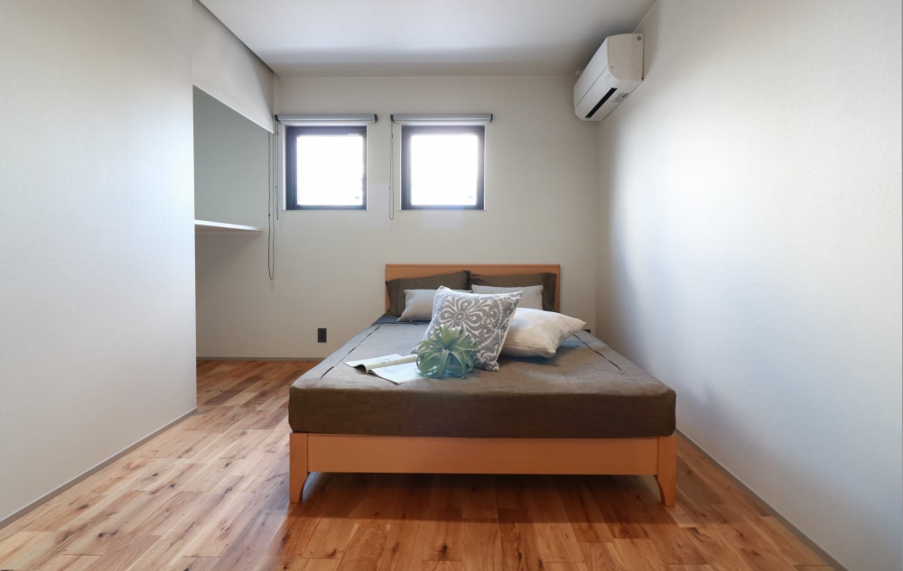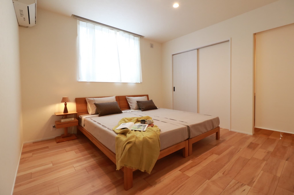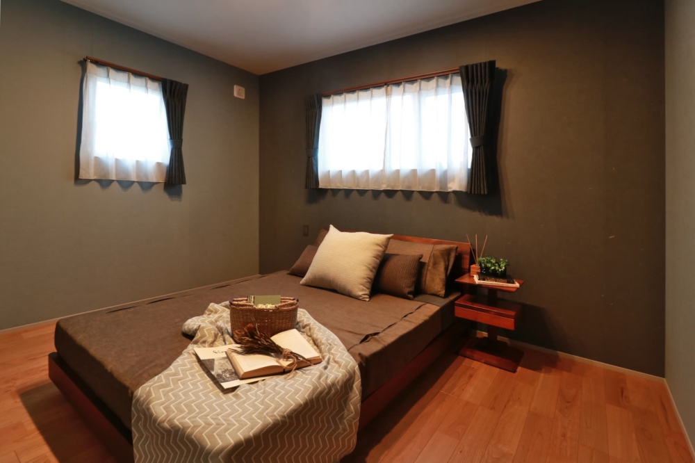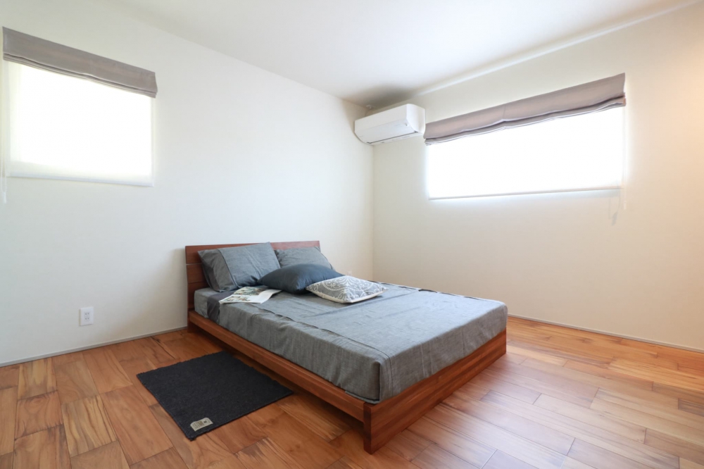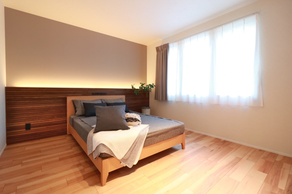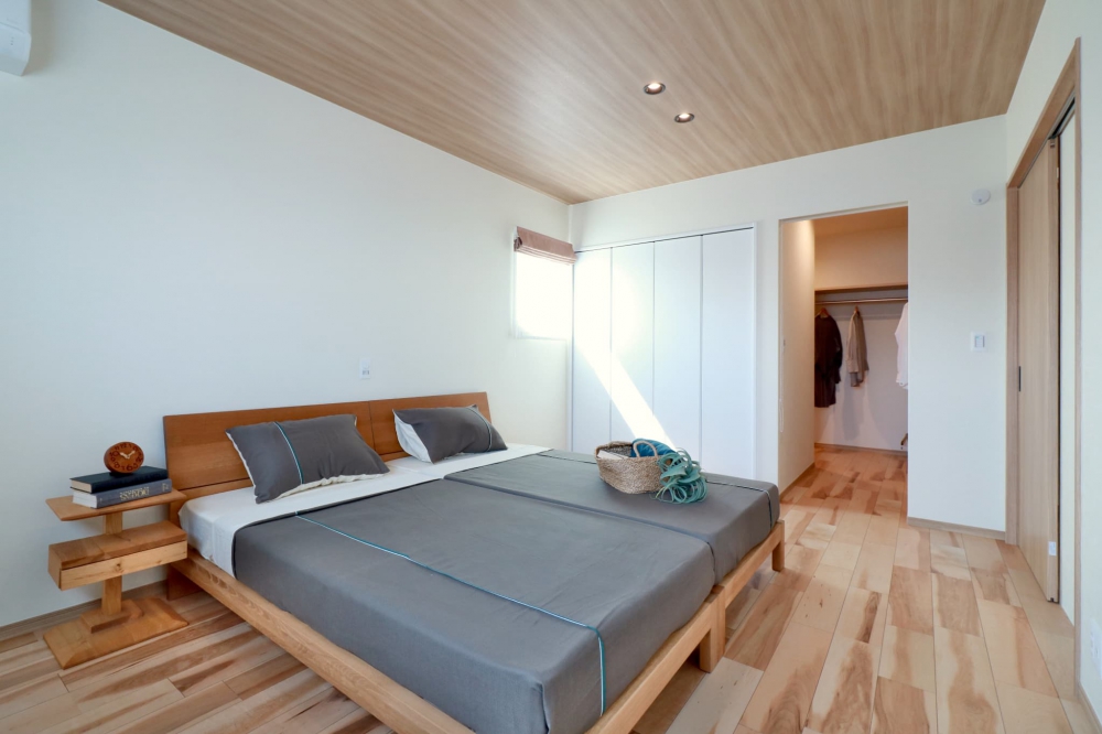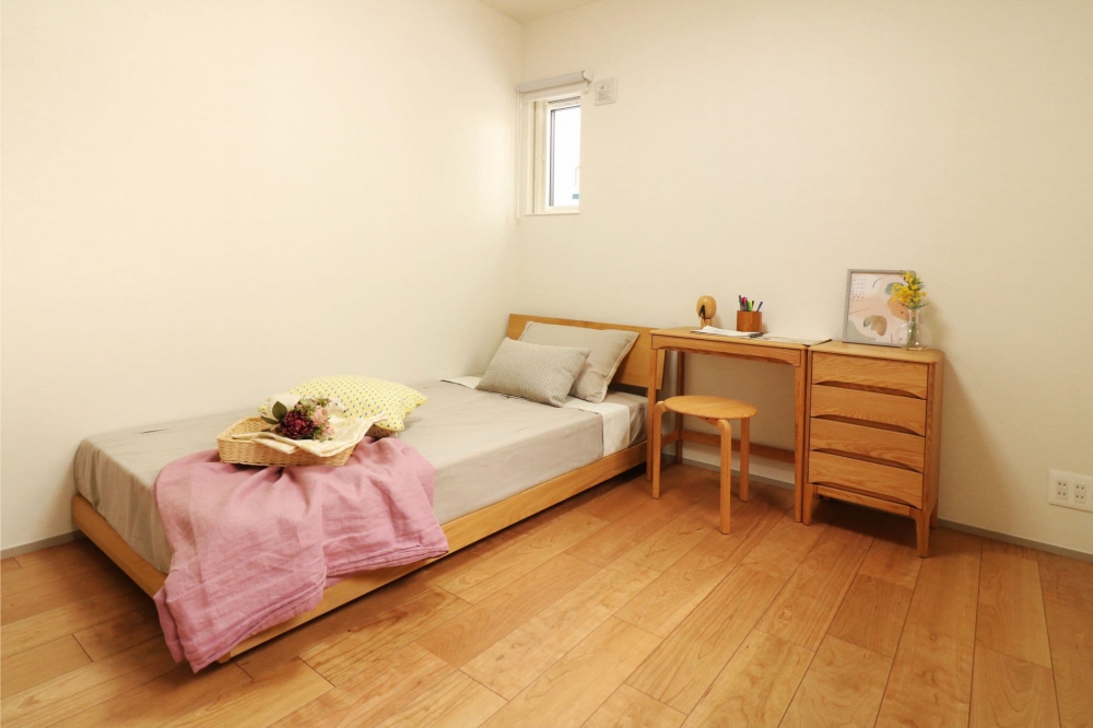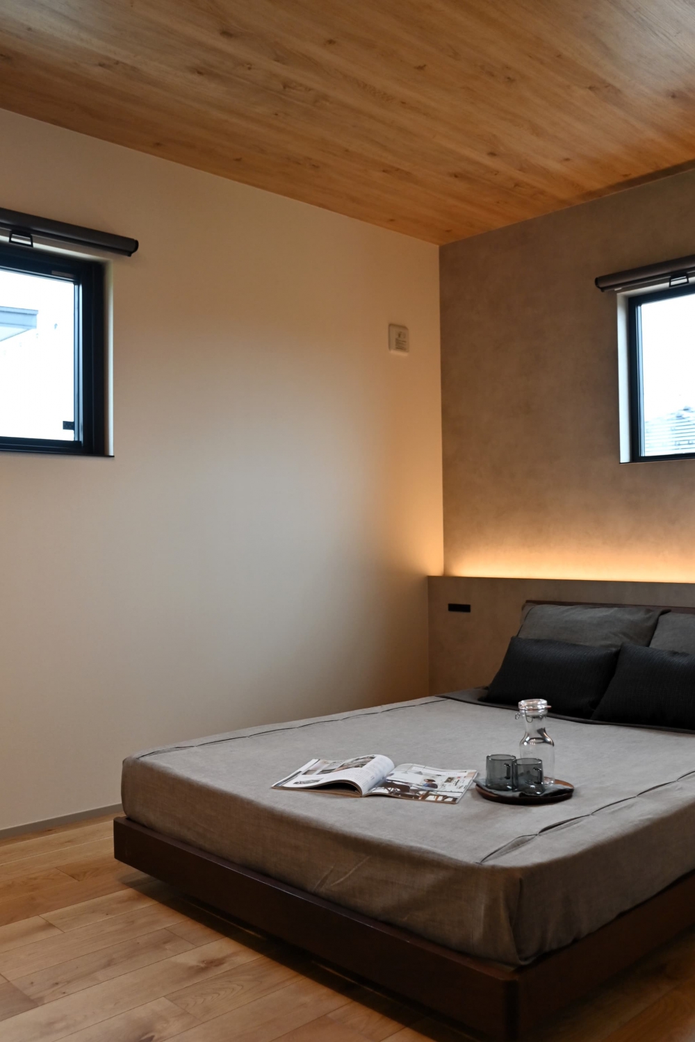 2階の寝室は落ち着きとエレガントさが共存し、ホワイトとグレー、木のコントラストが温かみを感じさせる外観が特徴です。