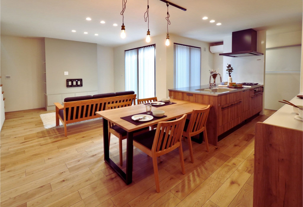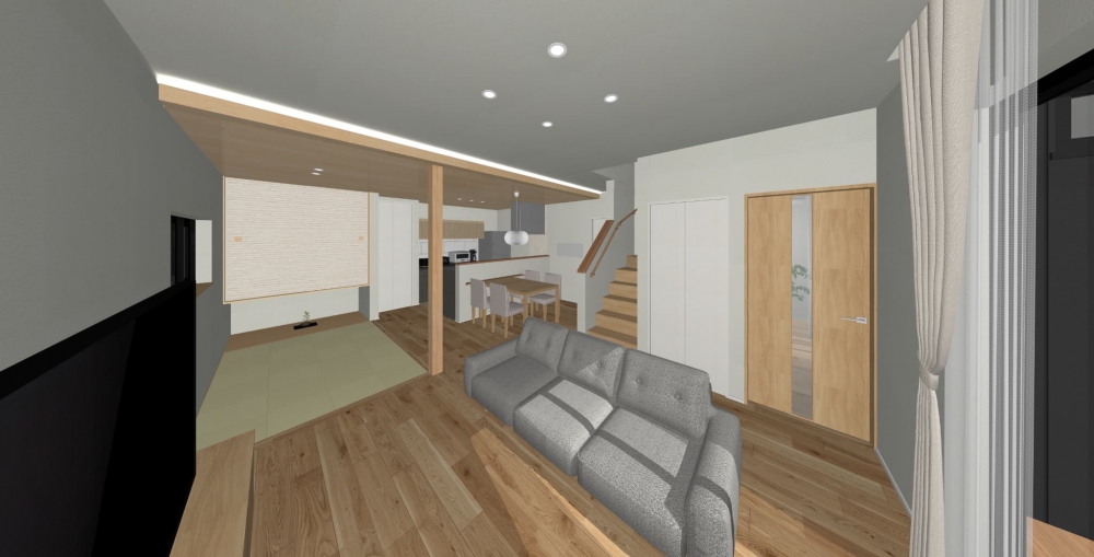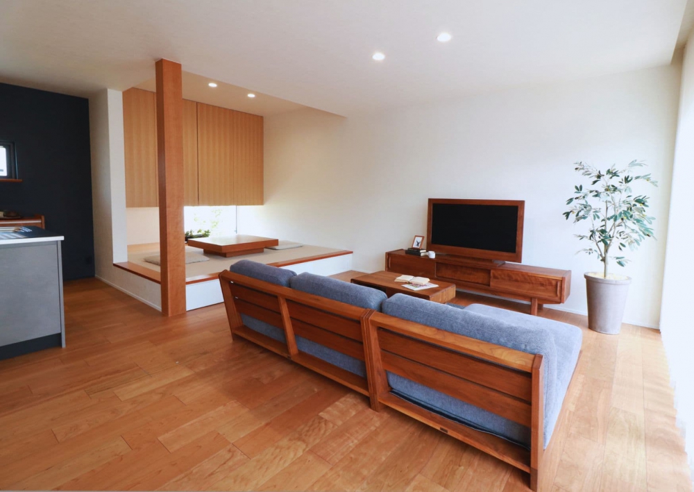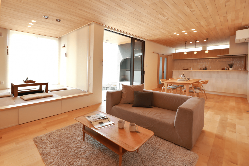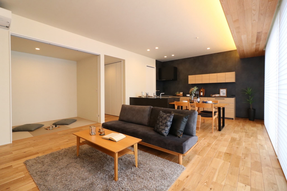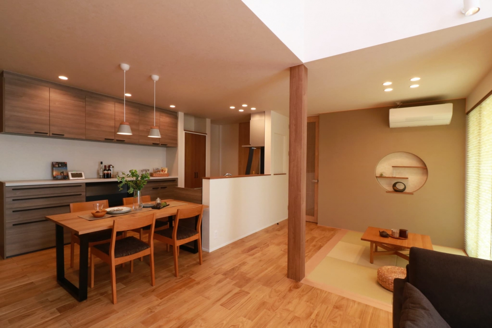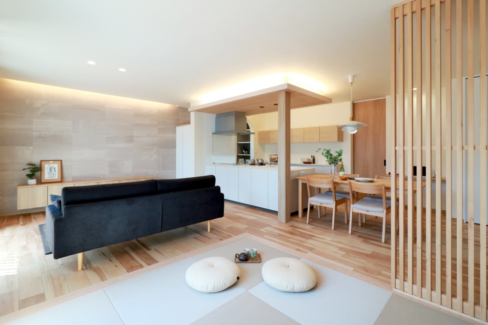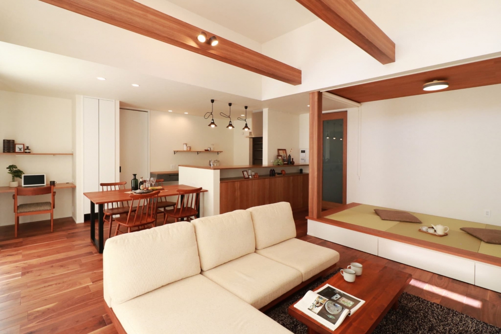 広々としたリビング・ダイニング・キッチンに隣接する畳コーナーが、家族の団らんとリラックス空間を演出。