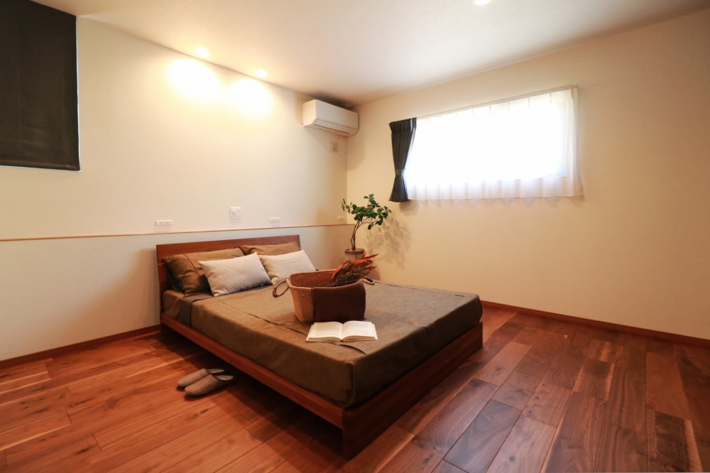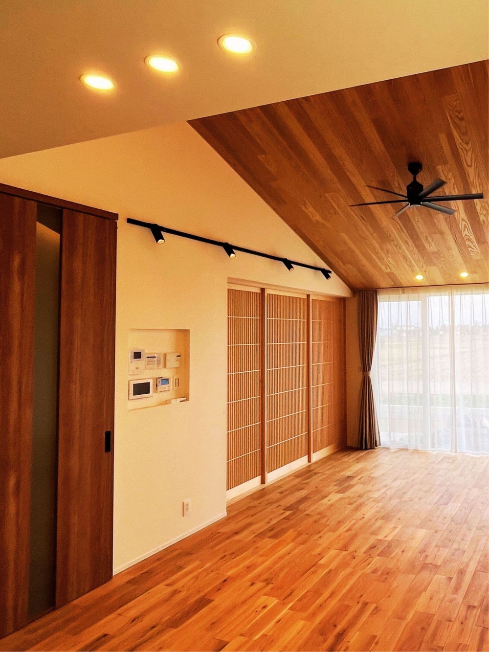 ウォルナットで統一された床板と木質天井が特徴的な美しい平屋が完成しました。