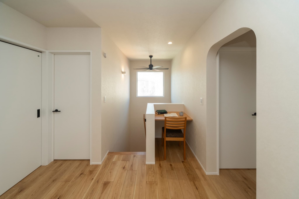 2階はナラ樫の床で統一され、子供部屋や寝室、豊富な収納を備え、暮らしやすさと意匠が調和しています。