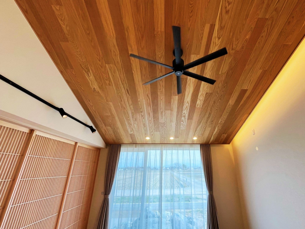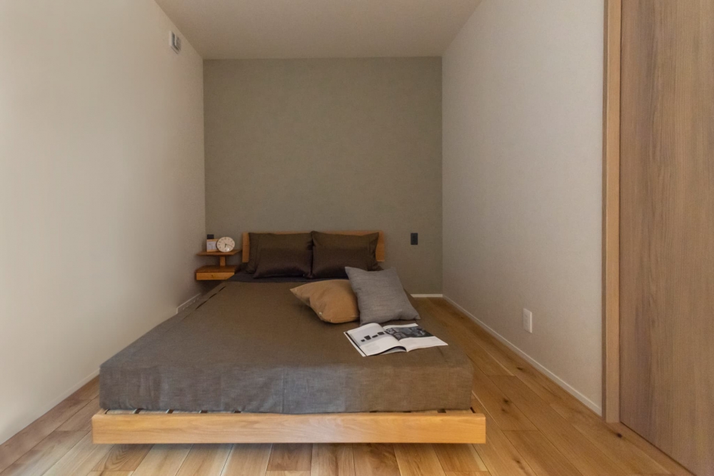 床にはナラの無垢材が用いられ、自然の美しさが際立ち、ライトグレーの塗壁がモダンで優雅な雰囲気をもたらしました。