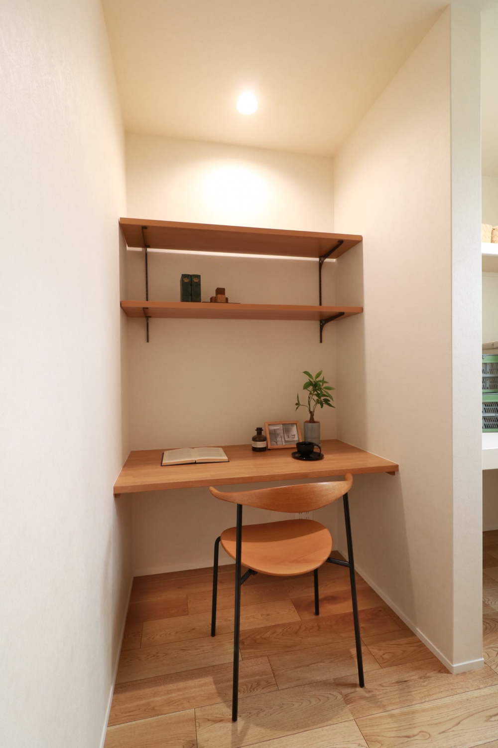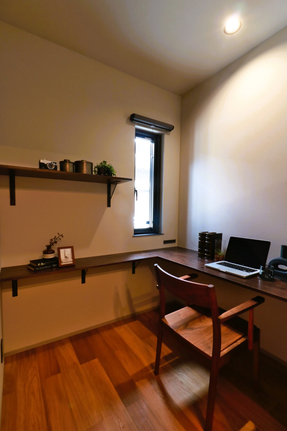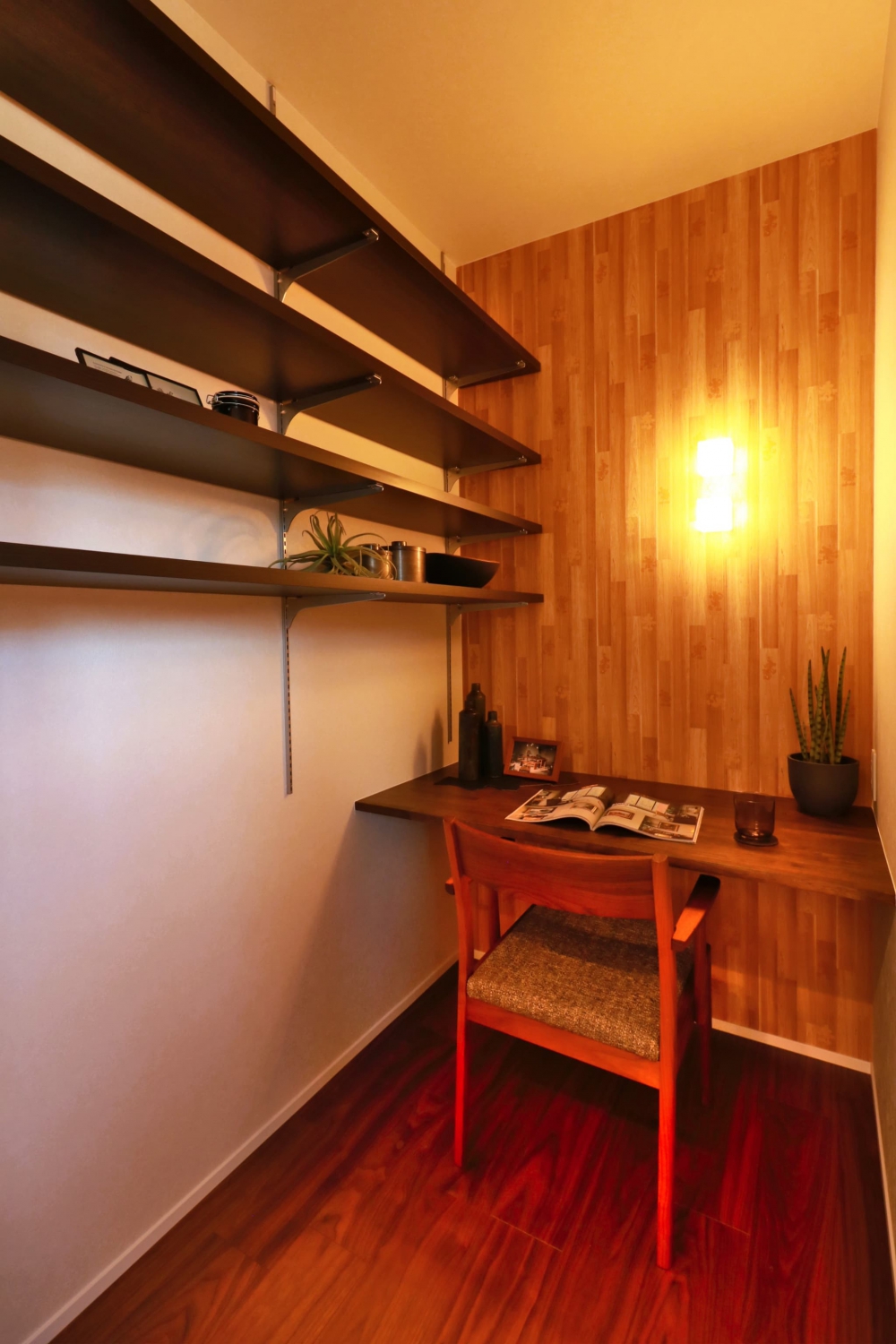 書斎は可動棚やレンガクロスがアクセントとなり、趣味と作業に最適な空間を提供します。
