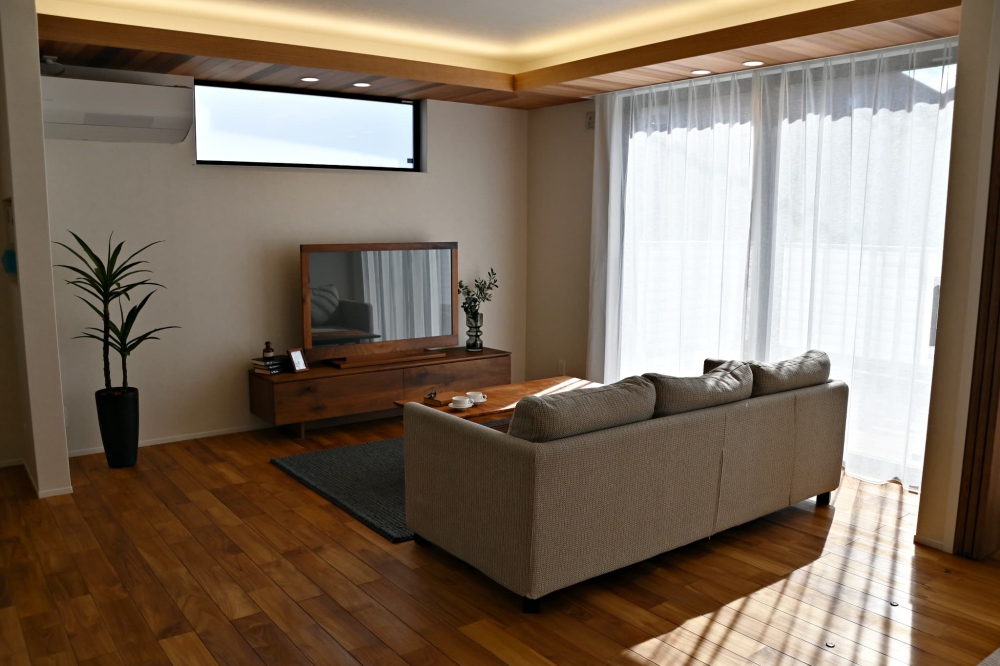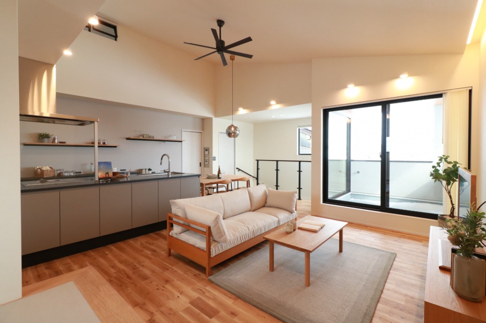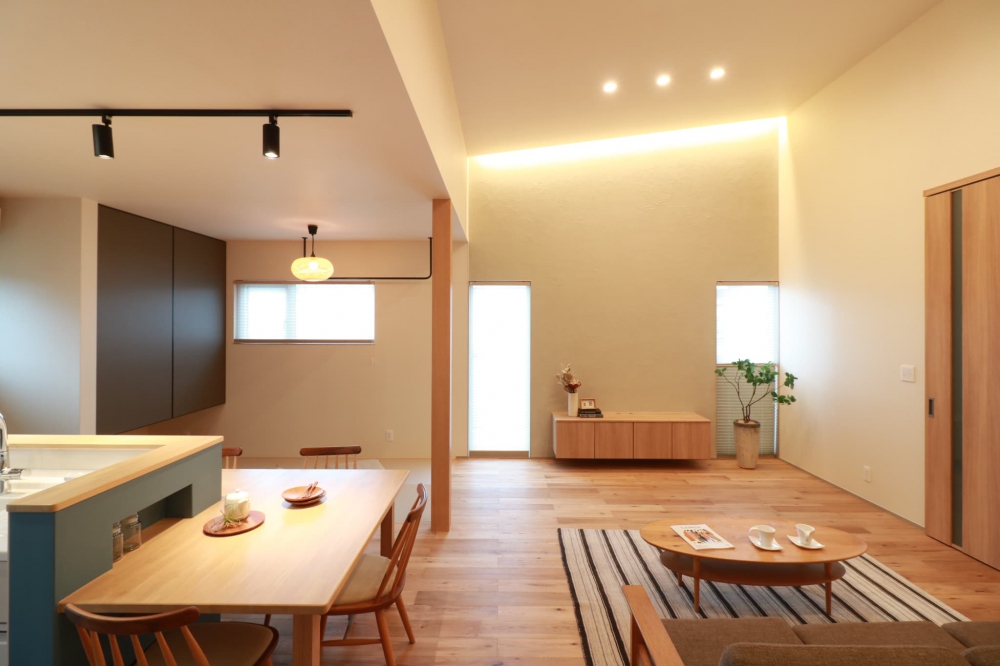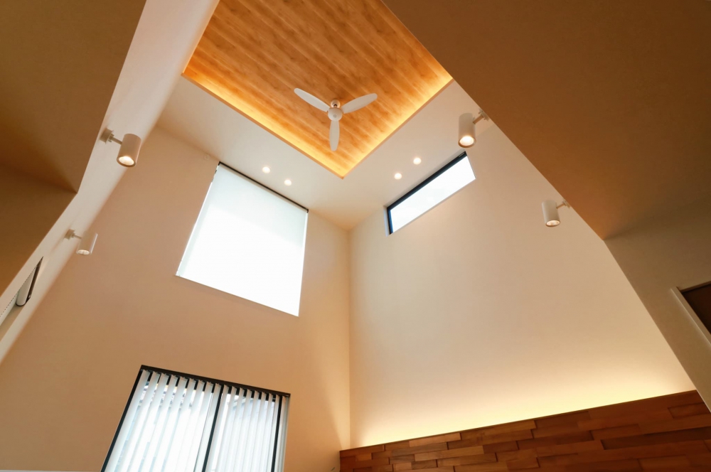 高天井の設計がリビングに広々とした開放感をもたらし、住む人に心地よいリラックス感を提供します。