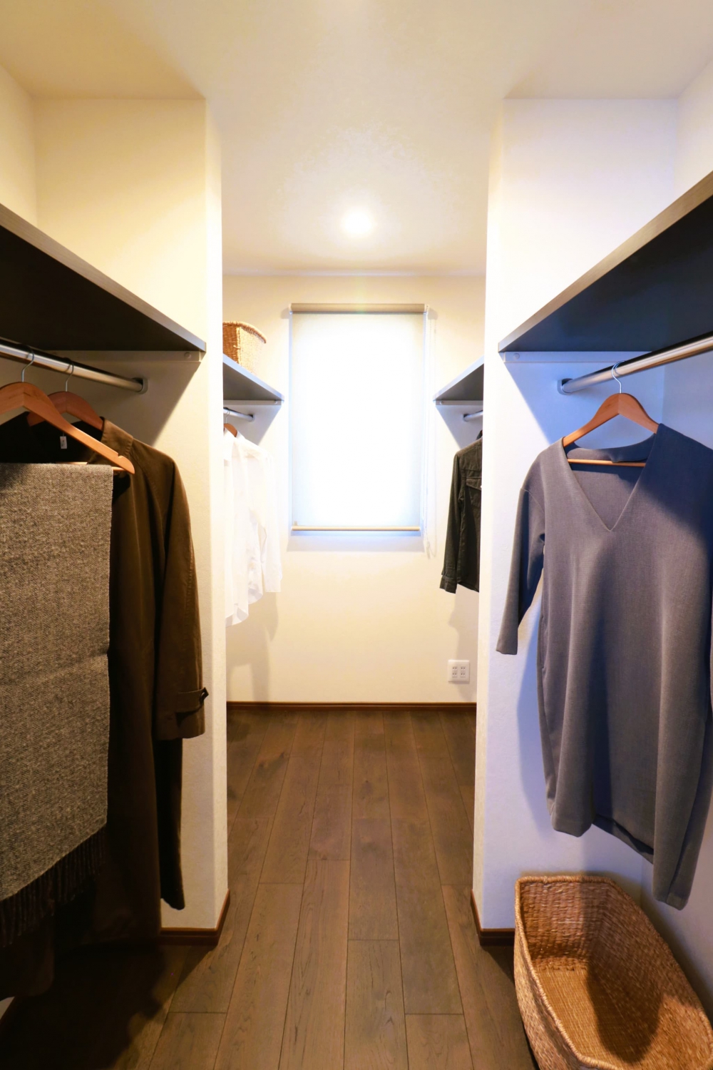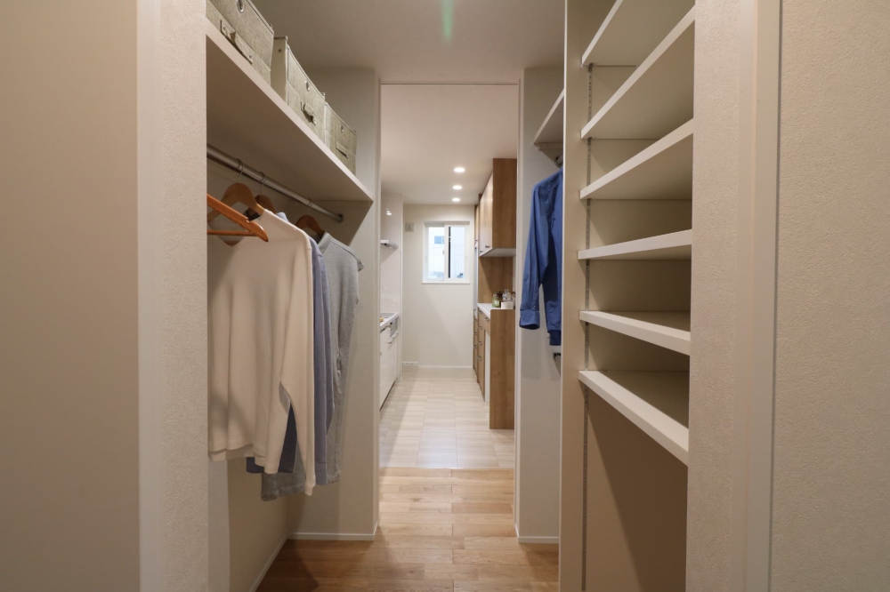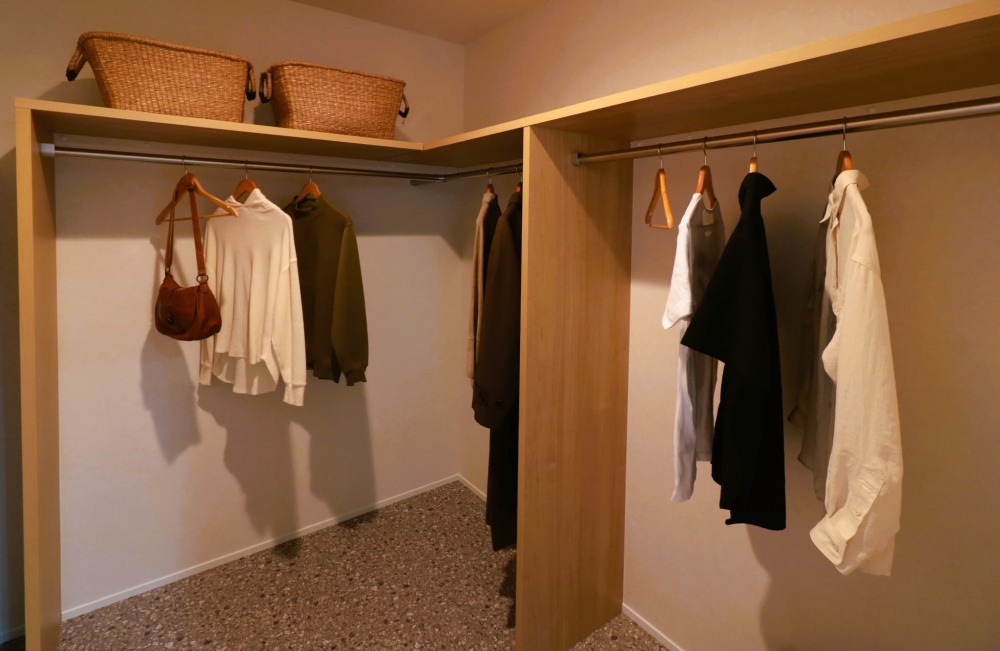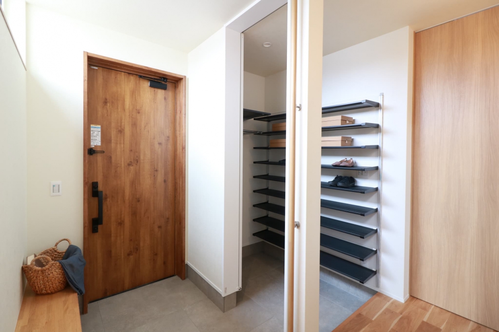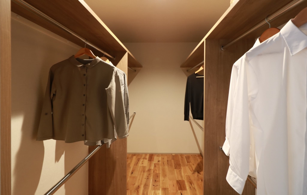 玄関横のクロークは効率的な収納と動線を両立し、寝室併設のウォークインクローゼットは