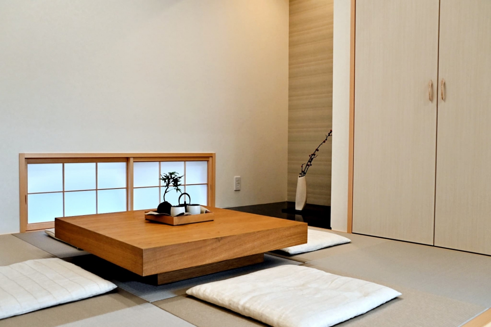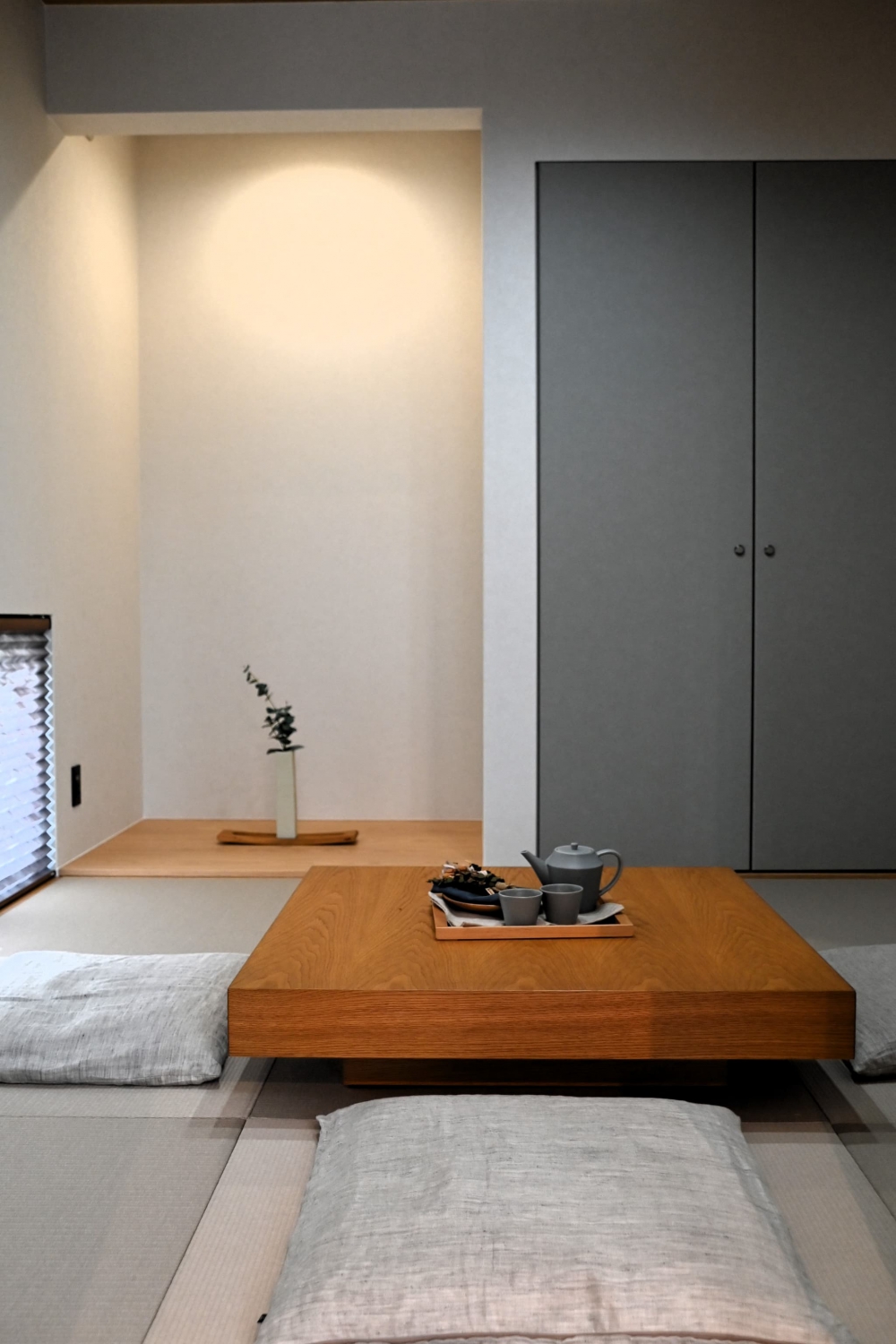 高級感あふれるLDKには、灰桜色の畳と雪見障子が調和する穏やかな和の空間が広がり、都会的なアクセントとして大胆な内装パネルが施されています。