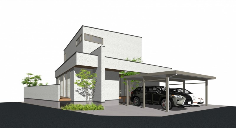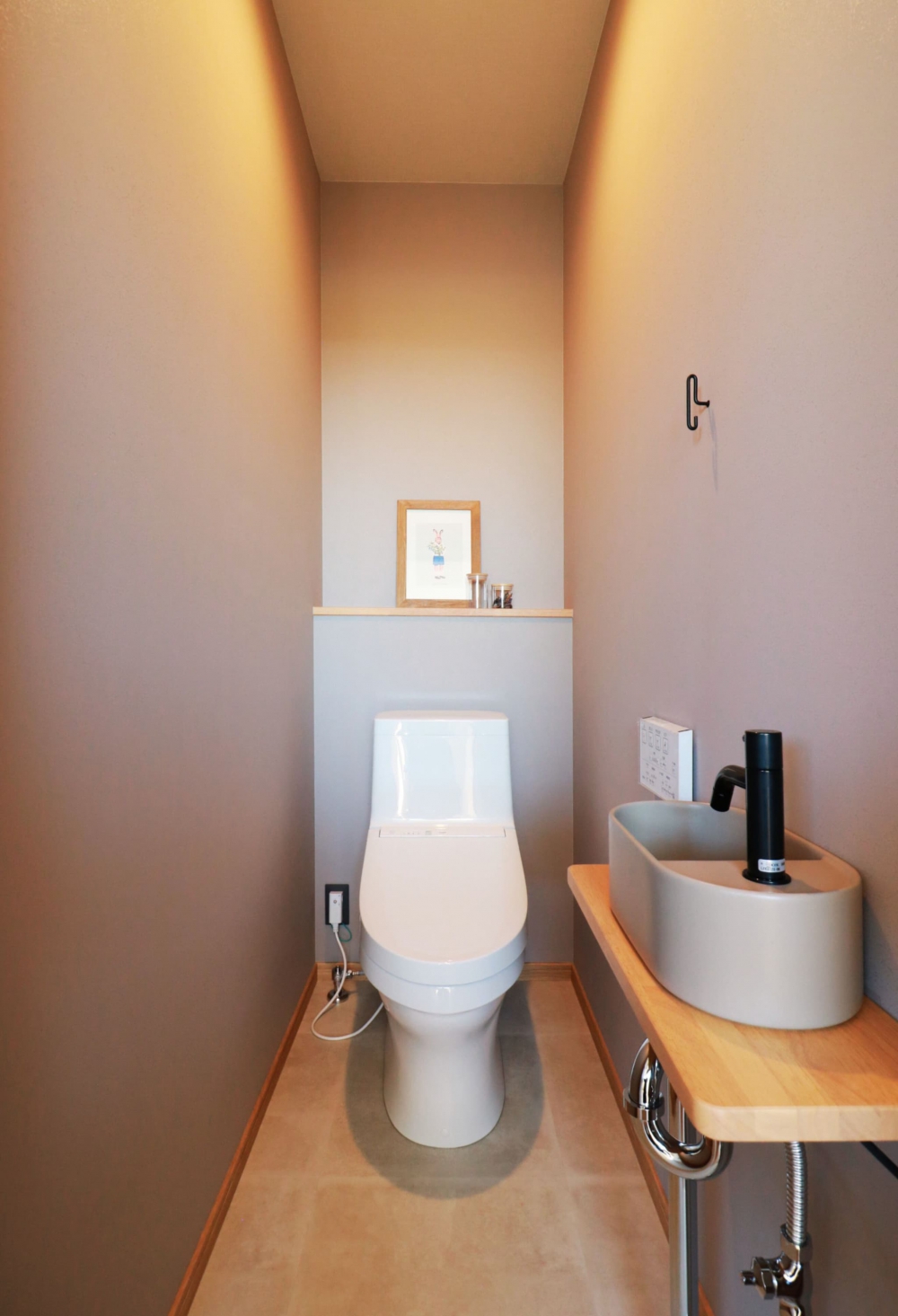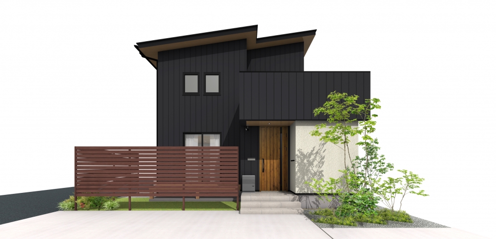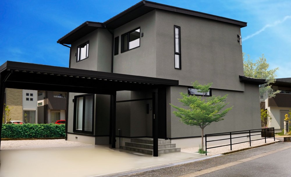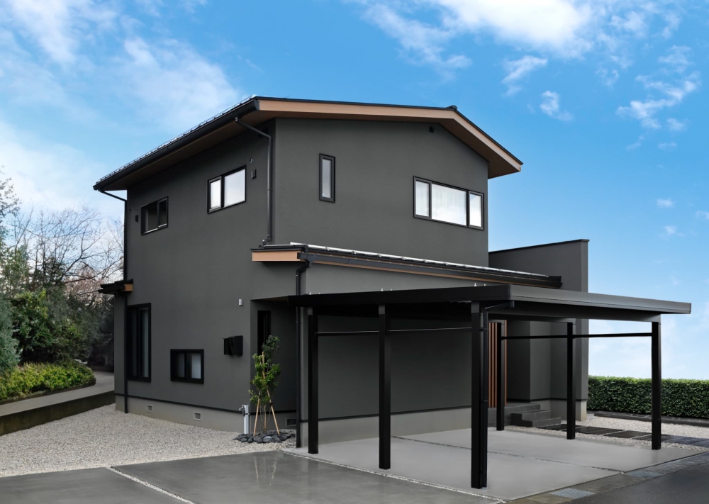 都会的なグレーの外観と、家族の優しさが伝わる温かな住まいです。